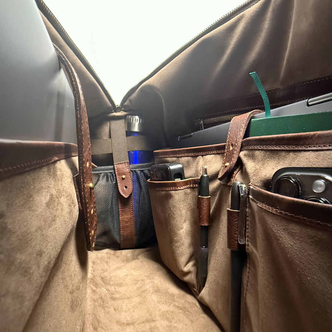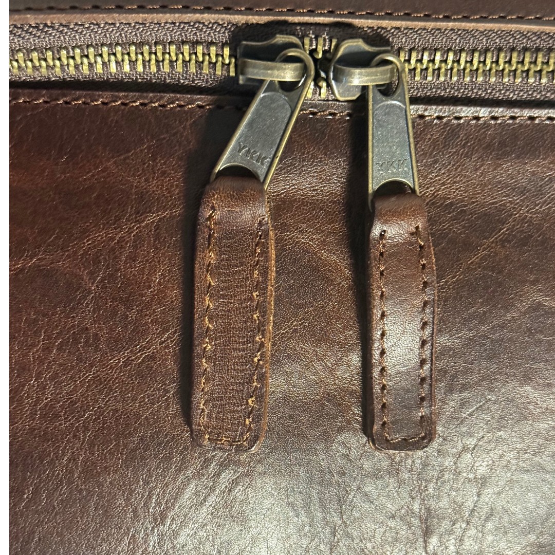 Interior lined with a soft, suede-like polyester fabric. Sturdy 8-9 oz leather handles designed for longevity and comfort. Premium YKK zippers with leather pull tabs for a seamless, elegant finish.