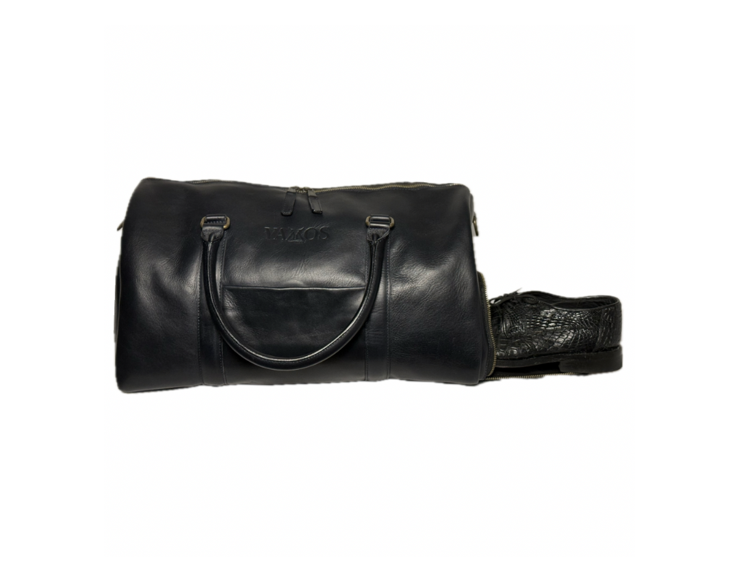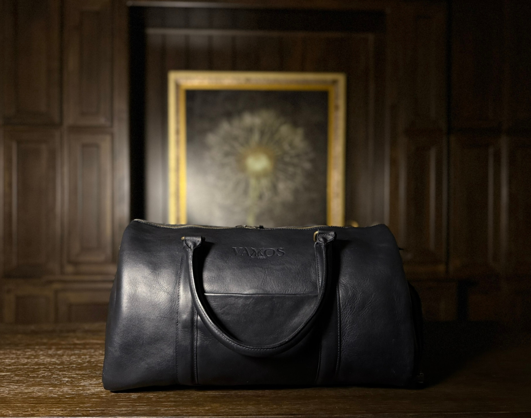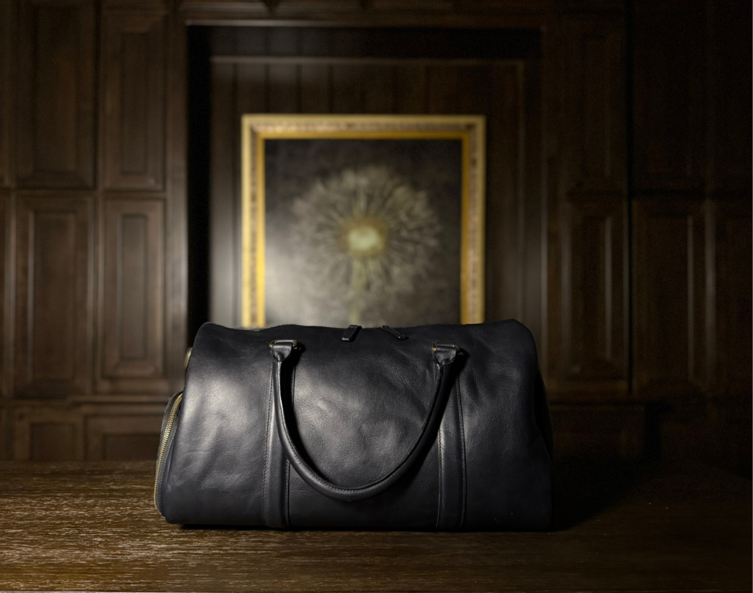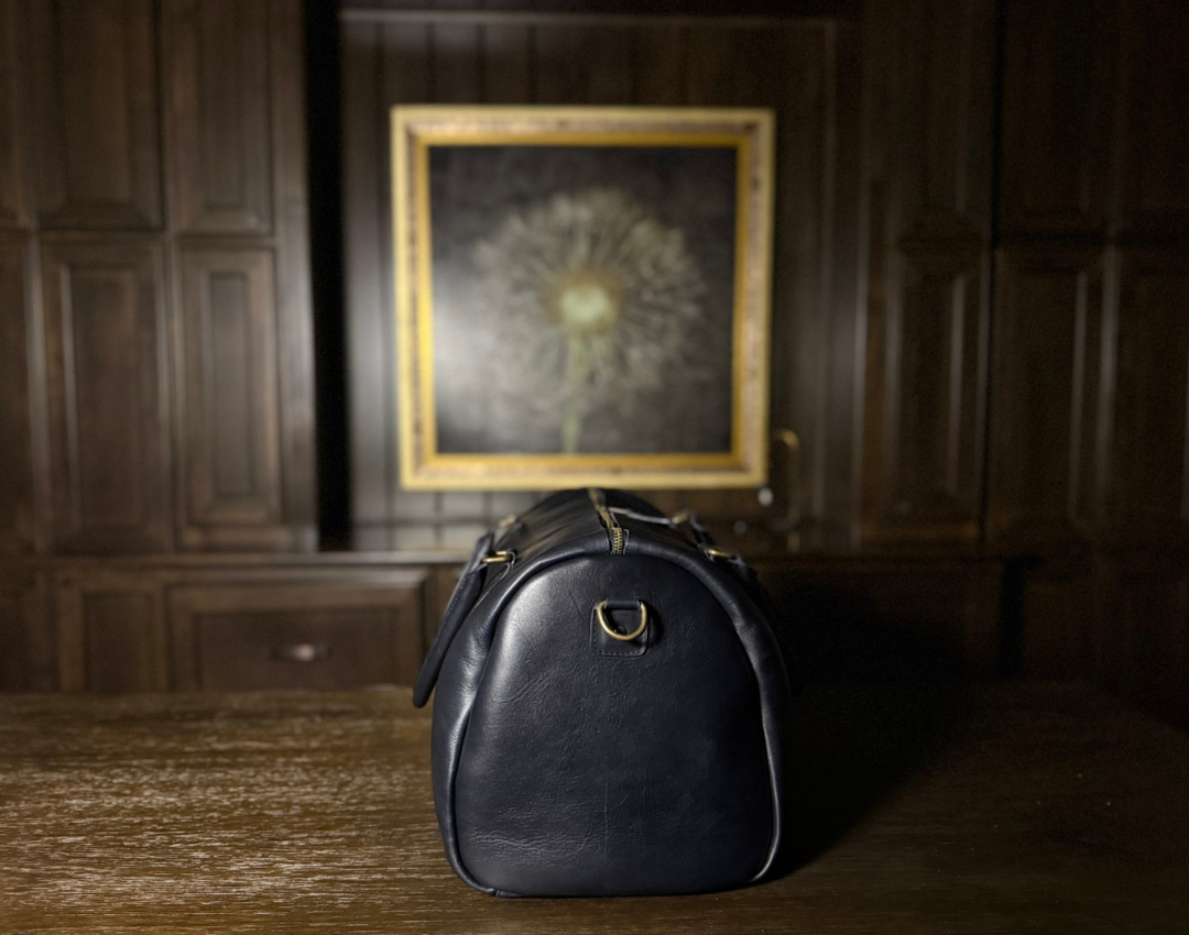 - Our Midnight Azul duffle bag is crafted from vegetable-tanned, full-grain cow leather. Featuring a striking pull-up effect and a waxed finish, it offers a rich, supple texture that exudes a unique appearance and durability.